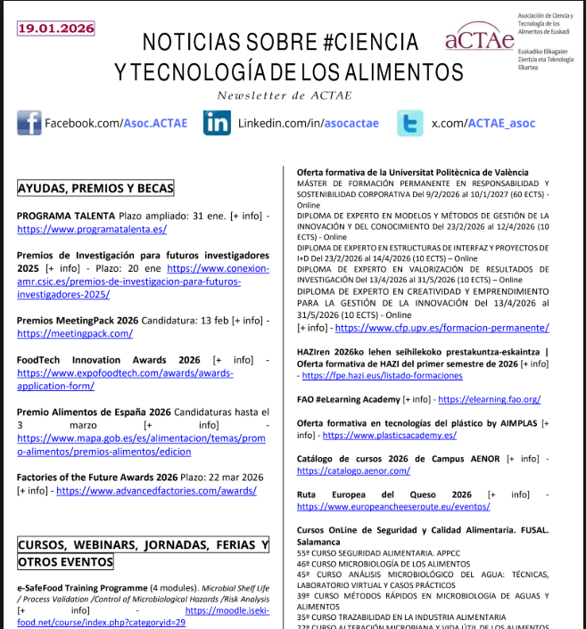 Este suplemento contiene las ayudas, becas, premios, eventos así como otras oportunidades en el campo agroalimentario. Disponible en formato PDF en Google Drive, así como en nuestros perfiles de las redes sociales @ACTAE_asoc, Asociación Actae y Asoc.ACTAE.